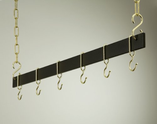 This Hammered Steel Hanging Bar Rack is functional yet stylish, and it looks great in any kitchen. Hang it over an island, a counter or above the sink. Strong, durable, and puts cookware and utensils an arms length away! The sleek look of the bar is enhanced by its durable powder-coated finish. Each rack comes with 2 pieces of 18" plated chain. Hooks are also plated. 6 unique bar hooks are included with the rack, for maximum efficiency. These racks were specially designed to ensure the hooks don't slide off the bar -- safe and secure. Keeping your kitchen organized, stylish, and modern has never been easier! Assembly level/degree of difficulty: Easy. Made in America Readmore .. .